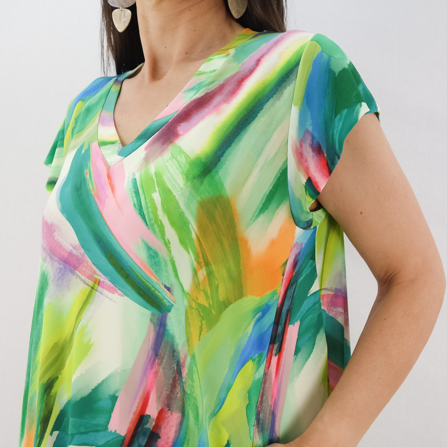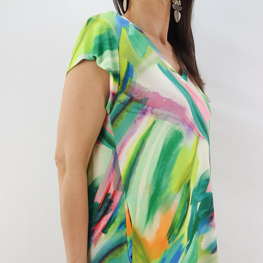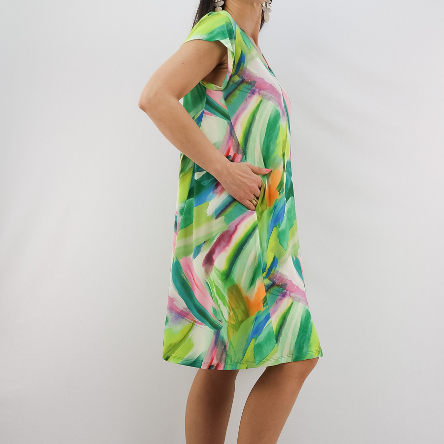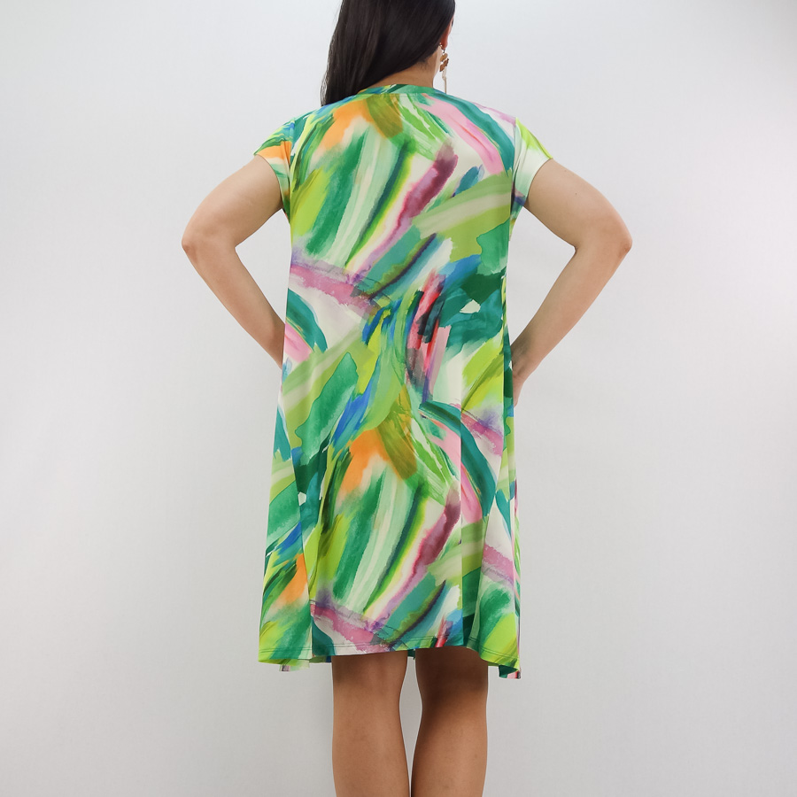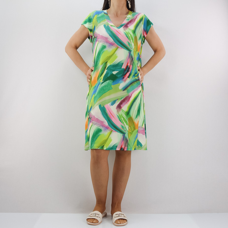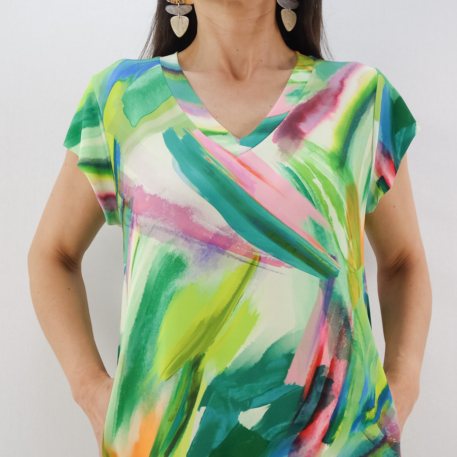 VESTIDO SCUSI ESTAMPADO DECOTE EM V COM BOLSOS NAS COSTURAS
