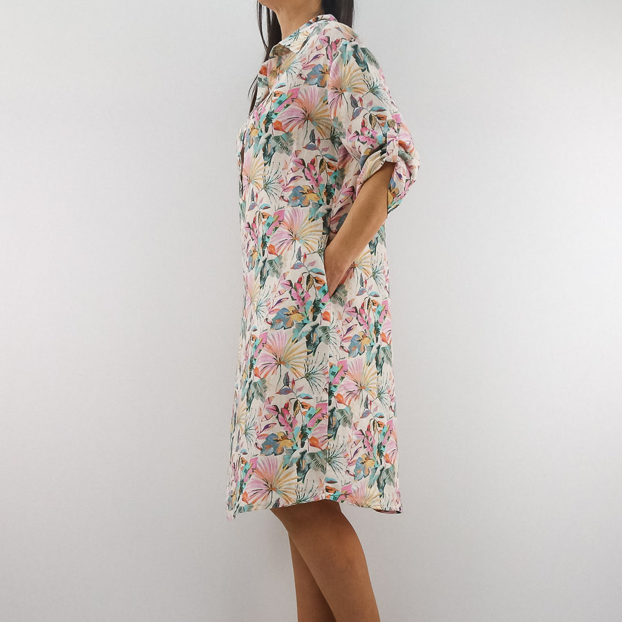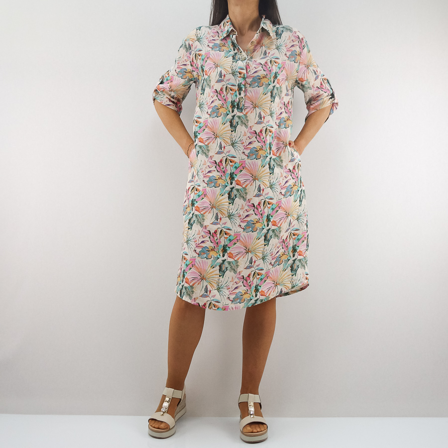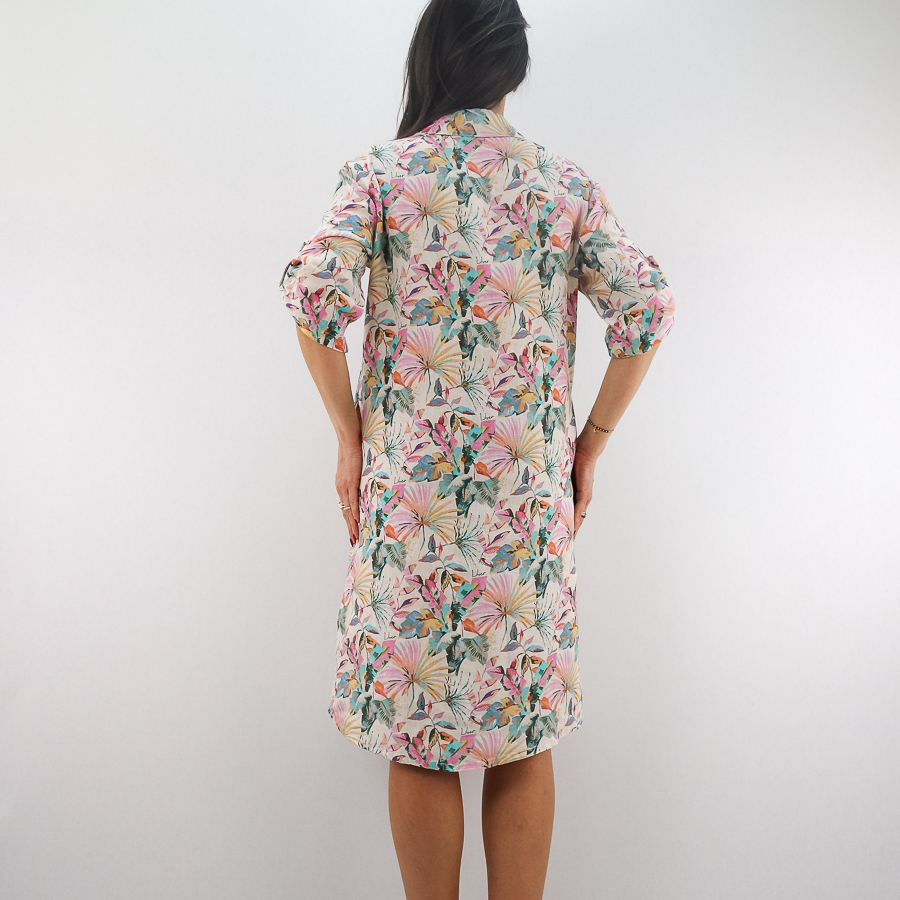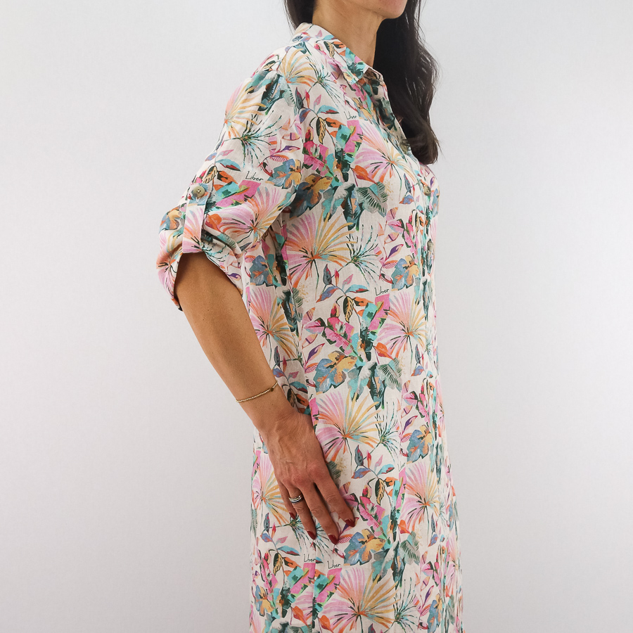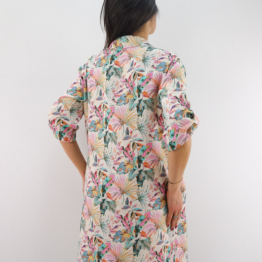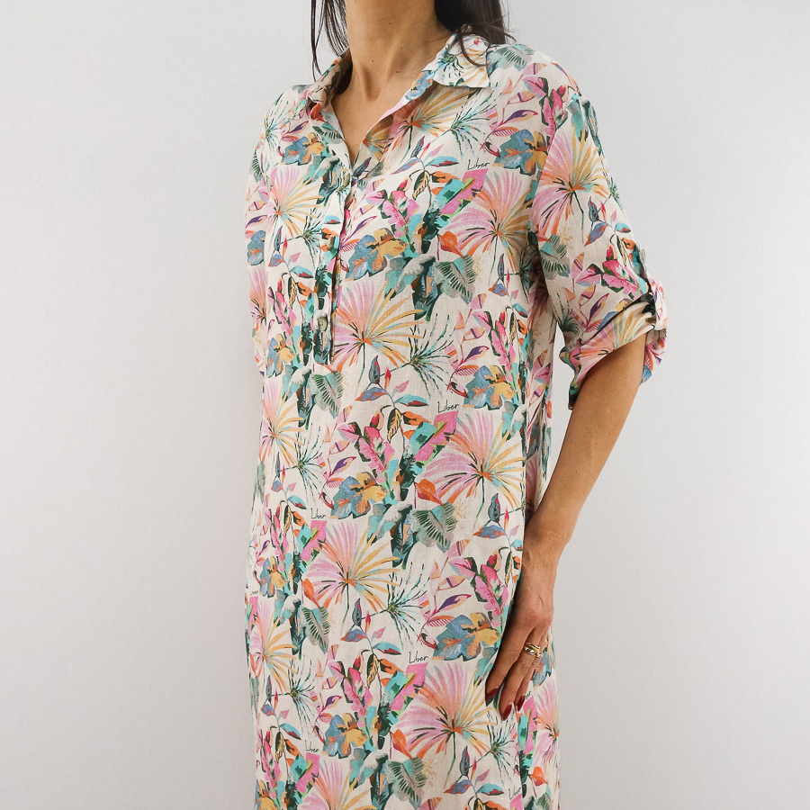 VESTIDO LJ LINHO COM ESTAMPADO FLORAL MANGA ARREGAÇADA